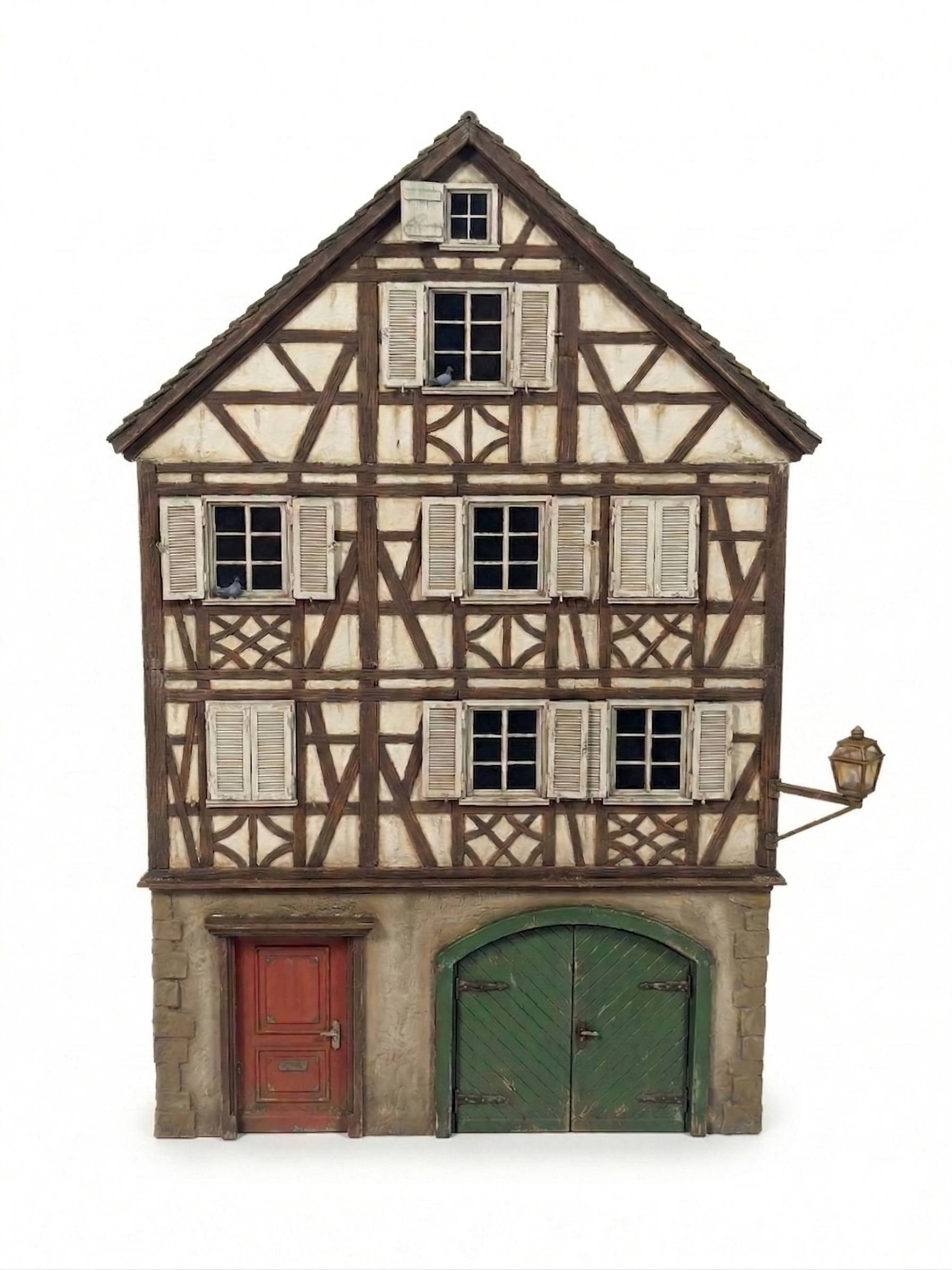 Esta es una maqueta a escala 1:35 que representa la fachada de un edificio histórico de estilo centroeuropeo, con entramado de madera (Fachwerk).