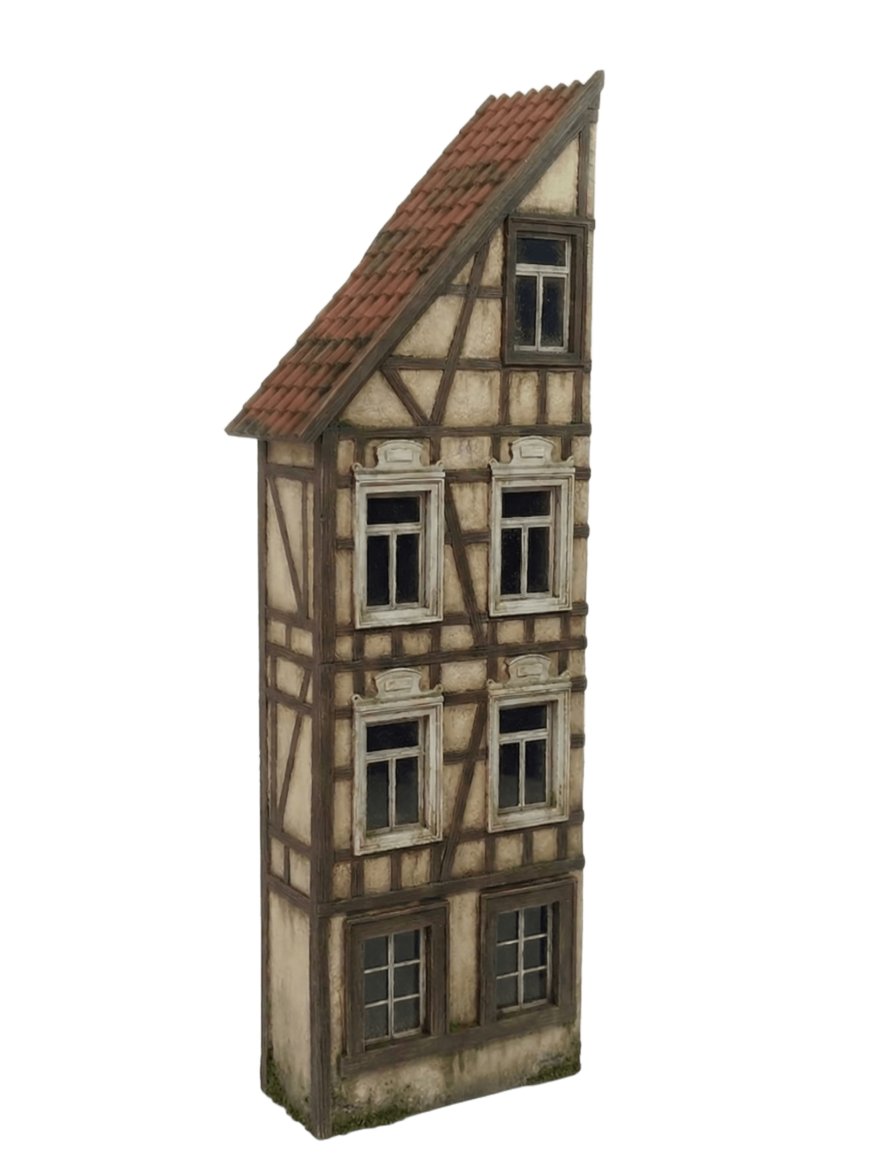 Esta referencia representa una sección o módulo complementario para un diorama, también a escala 1:35, con estilo arquitectónico de entramado de madera (Fachwerk).