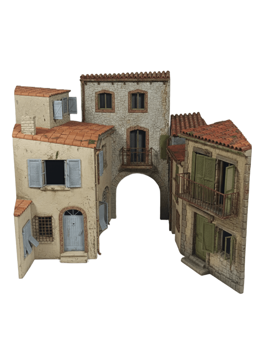 Dale vida y realismo a tus dioramas con este exclusivo conjunto de cinco viviendas a escala 1:35, inspirado en la arquitectura tradicional de las zonas mediterráneas. Cada estructura presenta un alto nivel de detalle, con texturas de piedra, tejados de teja y elementos característicos como balcones, persianas y arcos.