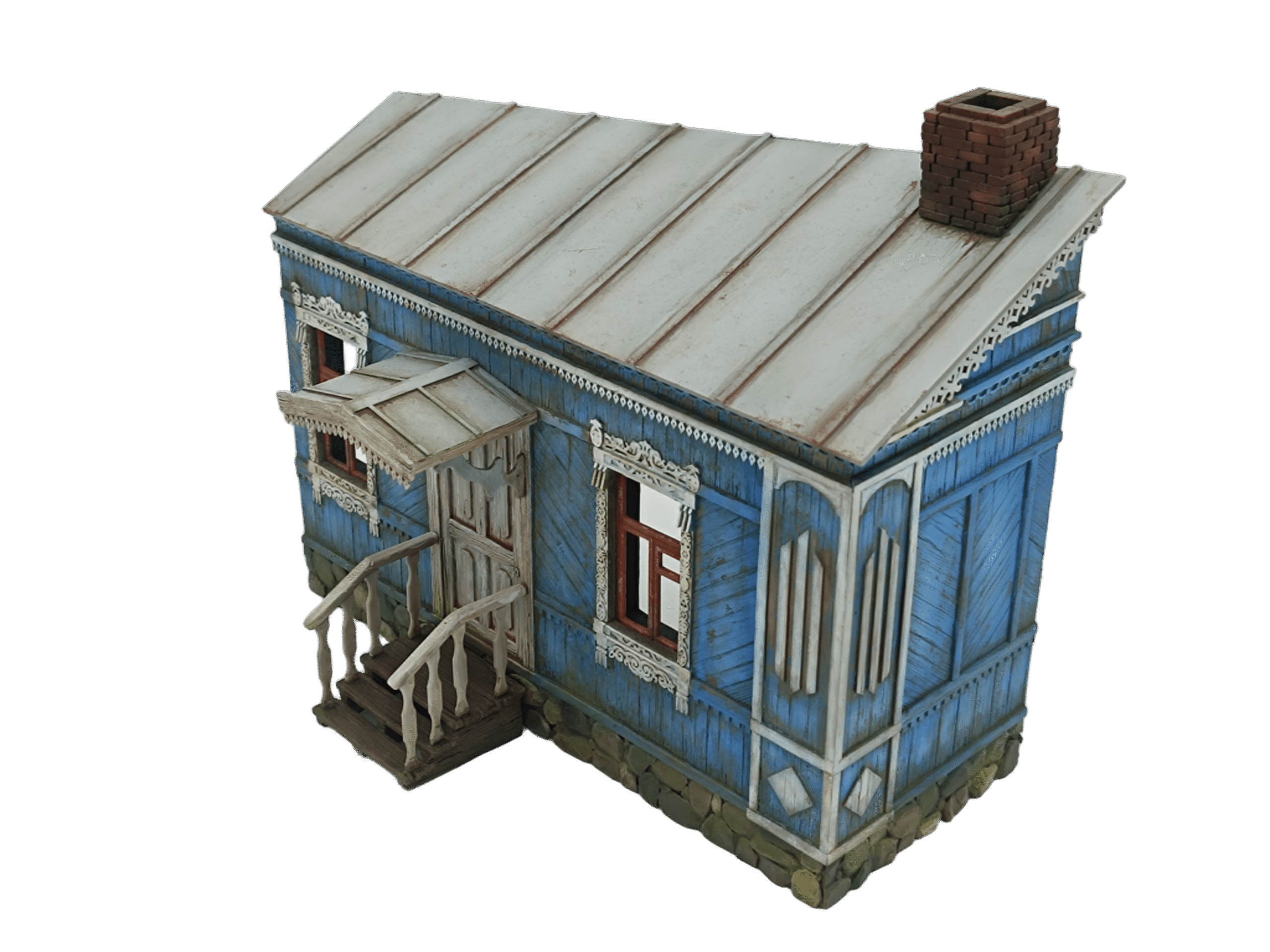 Isba a escala 1:35 que representa la tipica vivienda campesina rusa. con unas dimesiones de 20 cm x 12 cm x 16 cm de altura.