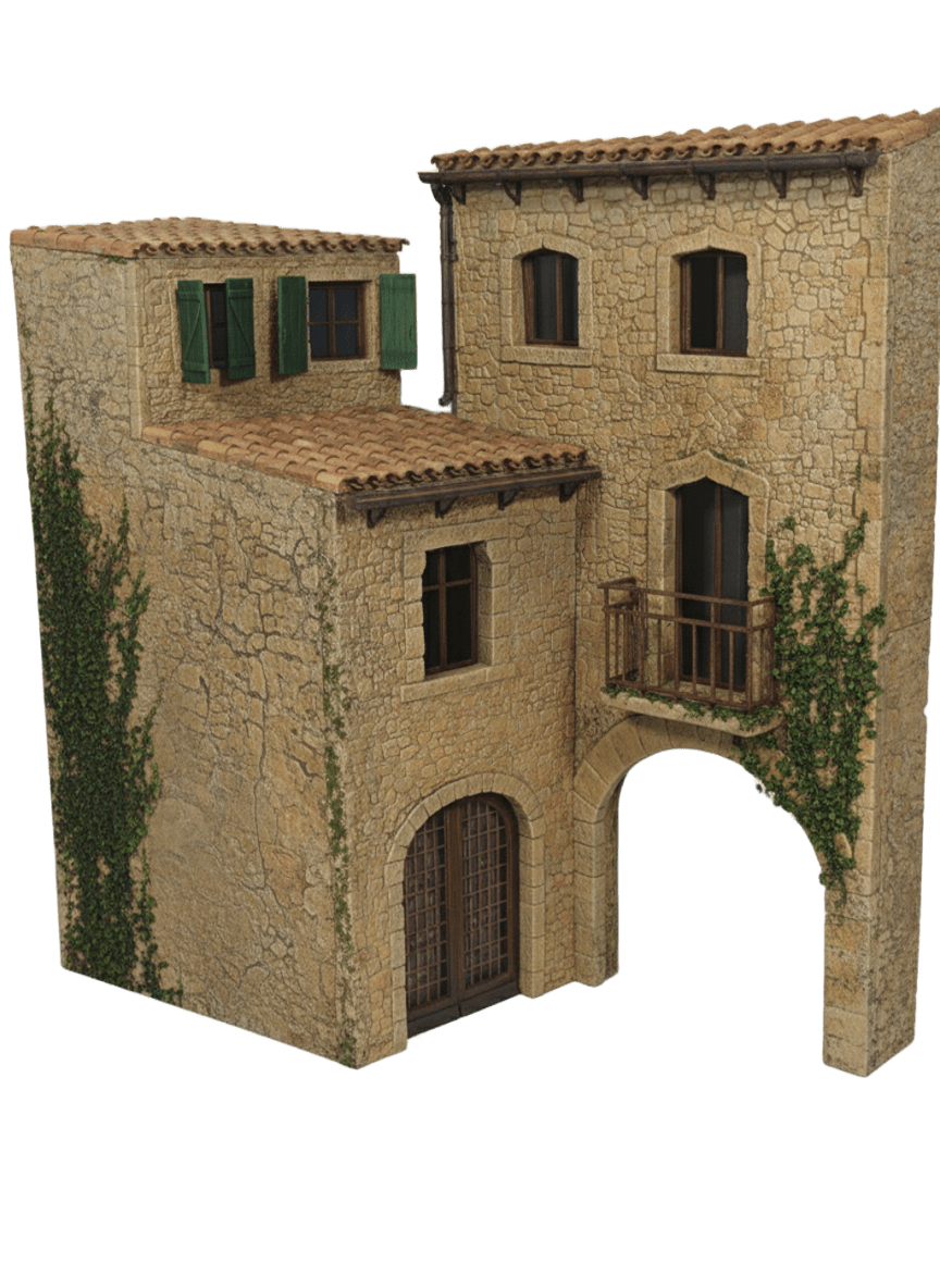 Vivienda en 3 niveles en esquina y arco a escala 1:35, en resina y detalles accesorios en 3d.